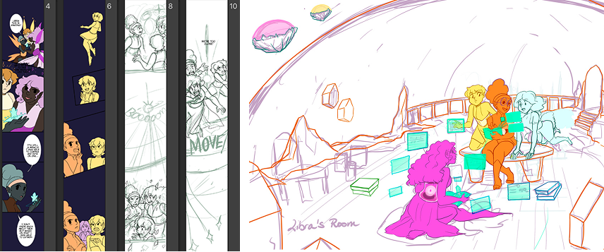 One the sketches have been established I bring the illustrations to scale. Sometimes this means lineart, flat colors, or even base of shapes blocked out for paintings. Some projects run in Multi-file formats for ease editing for digital and print distributions.